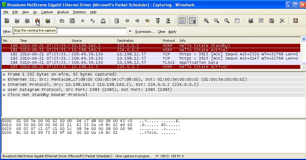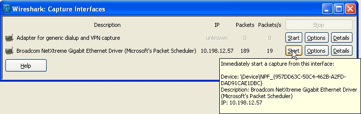 การทำดังกล่าวนี้ จะเป็นการเปิดอินเทอร์เฟซการจับแพ็กเก็ต เราสามารถเลือก NIC ที่เชื่อมต่อกับด้านหลังของโทรศัพท์ IP ที่เราจะจับภาพได้ ตามภาพด้านล่างนี้ คลิก Start เพื่อเริ่มการจับแพ็กเก็ตนั้น ๆ ได้เลยครับ