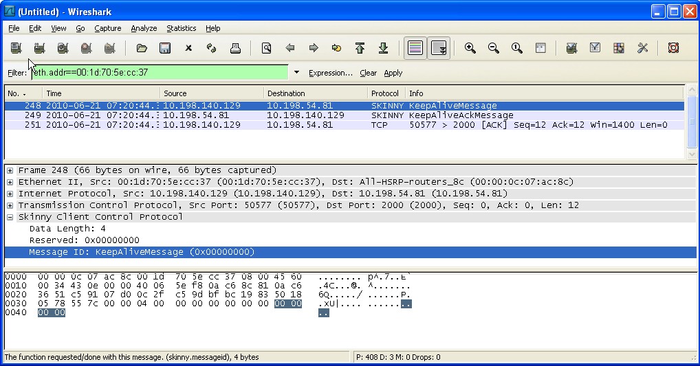 Traffic เริ่มขึ้นที่หน้าต่างด้านล่าง ซึ่งอาจจะขึ้นอยู่กับการใช้งานของพีซีในปัจจุบันด้วยนะครับ อาจมีผลทำให้มี Traffic จำนวนมาก หากต้องการกรองให้ใช้ตัวกรอง eth.addr กับ MAC Address ของโทรศัพท์ IP ทราฟฟิกที่ได้ควรแสดงเฉพาะทราฟฟิกที่เข้าและออกจากไอพีโฟนเท่านั้นครับ ดังตัวอย่างภาพด้านล่างครับ