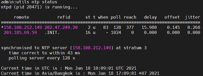 utils ntp status ใช้สำหรับตรวจสอบสถานะของเวลา รวมไปถึง NTP Source, stratum ที่เราทำการ Syn ออกไปด้วย
