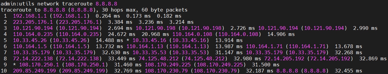 utils network traceroute 8.8.8.8 ใช้สำหรับตรวจสอบสถานะของเส้นทางไปถึงปลายทางที่เรากำหนด เช่น google dns 8.8.8.8 นั่นเอง