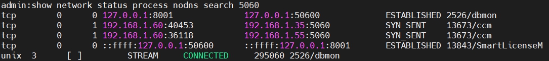 show network status [process nodns search [search term]] ใช้สำหรับตรวจสอบ connection ที่ port ต่าง ๆ บน CUCM