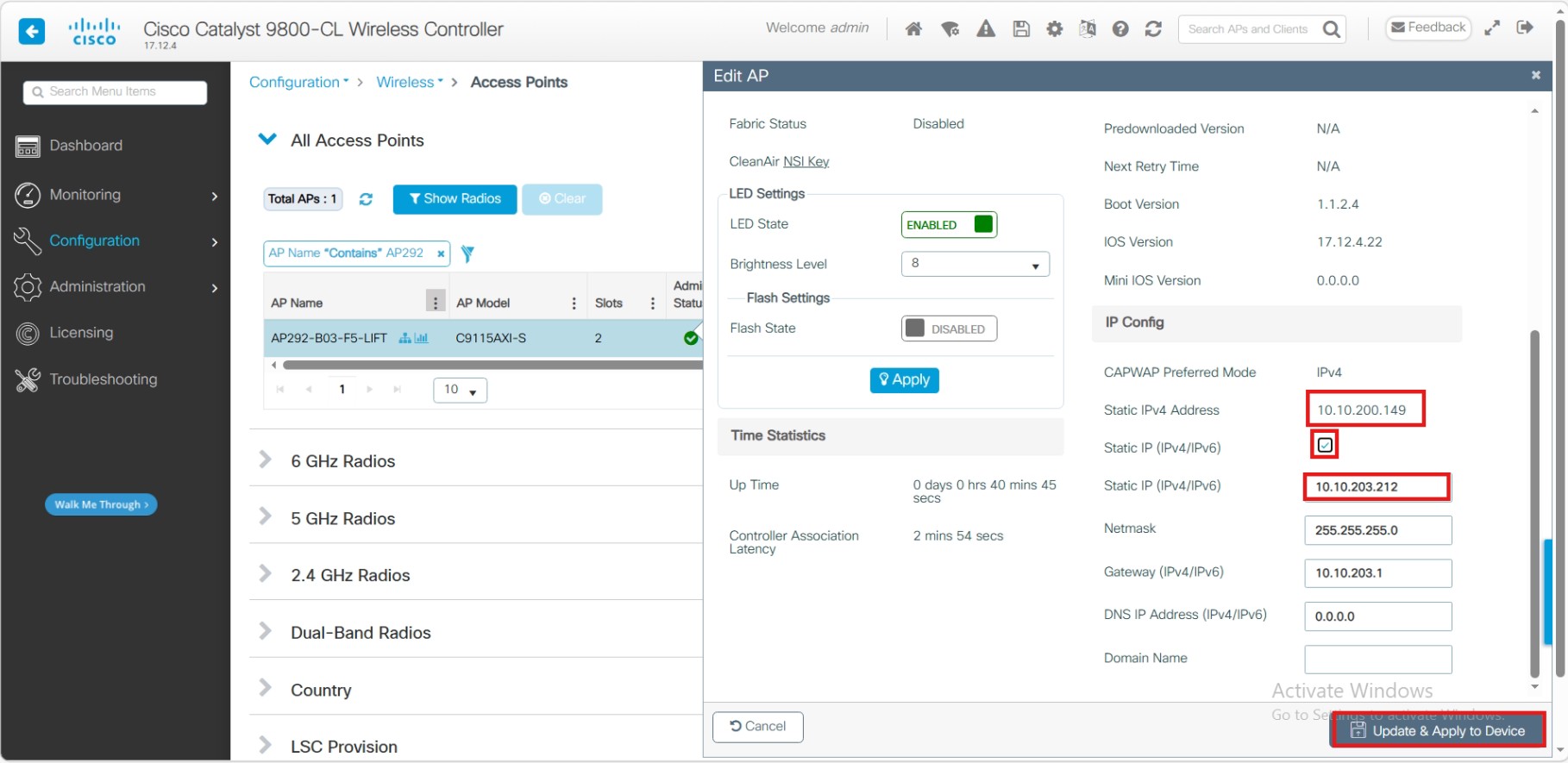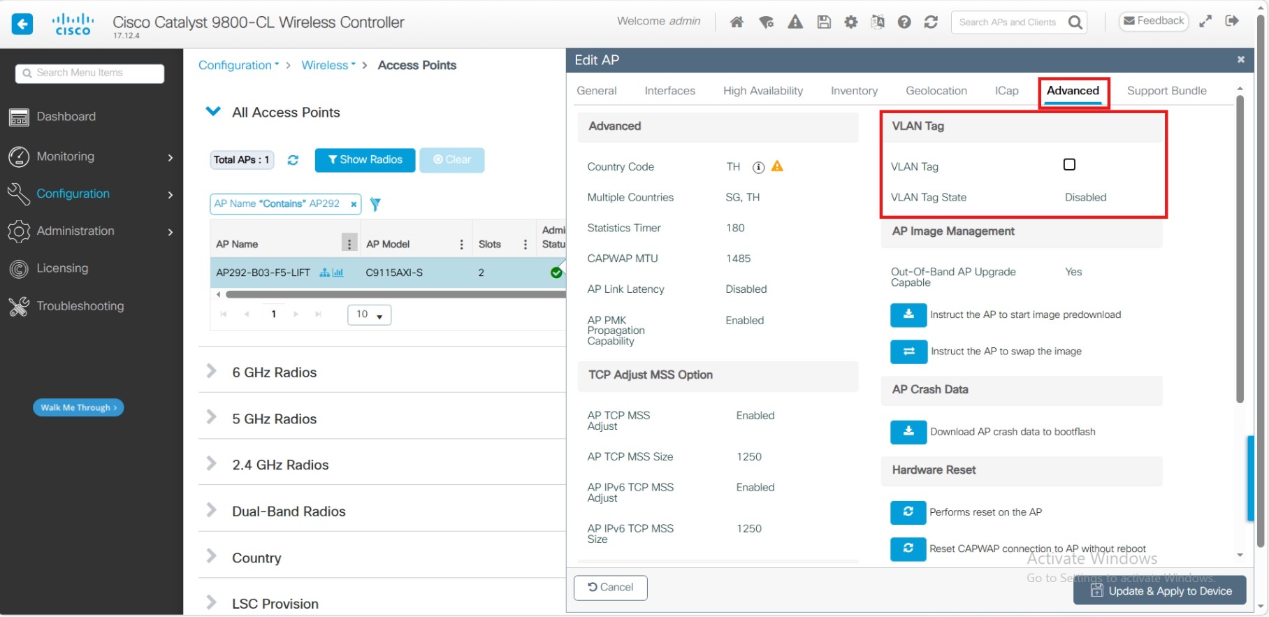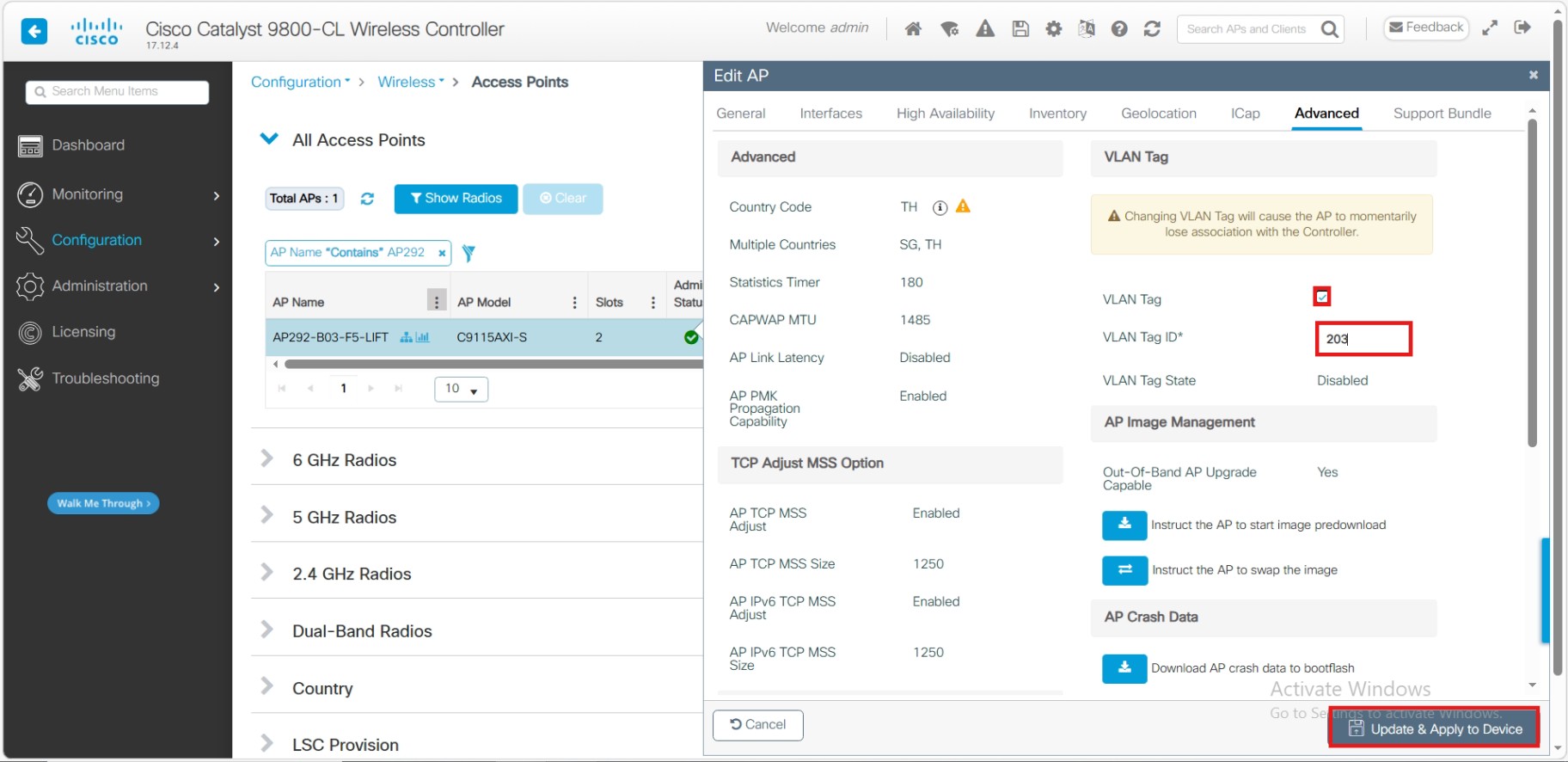 ให้เราติ๊กในช่อง VLAN Tag เพื่อทำการใส้ VLAN ที่เราต้องการ Tag ให้กับ AP จากนั้นกด Update & Apply to Device (หมายเหตุ: ควรตรวจสอบให้แน่ใจว่า Port ของ Switch ที่เชื่อมต่อกับ AP นั้น Allow VLAN ที่เราระบุไว้ด้วย มิฉะนั้น AP อาจไม่สามารถ Join กลับมายัง WLC ได้หลัง AP Reboot)